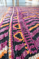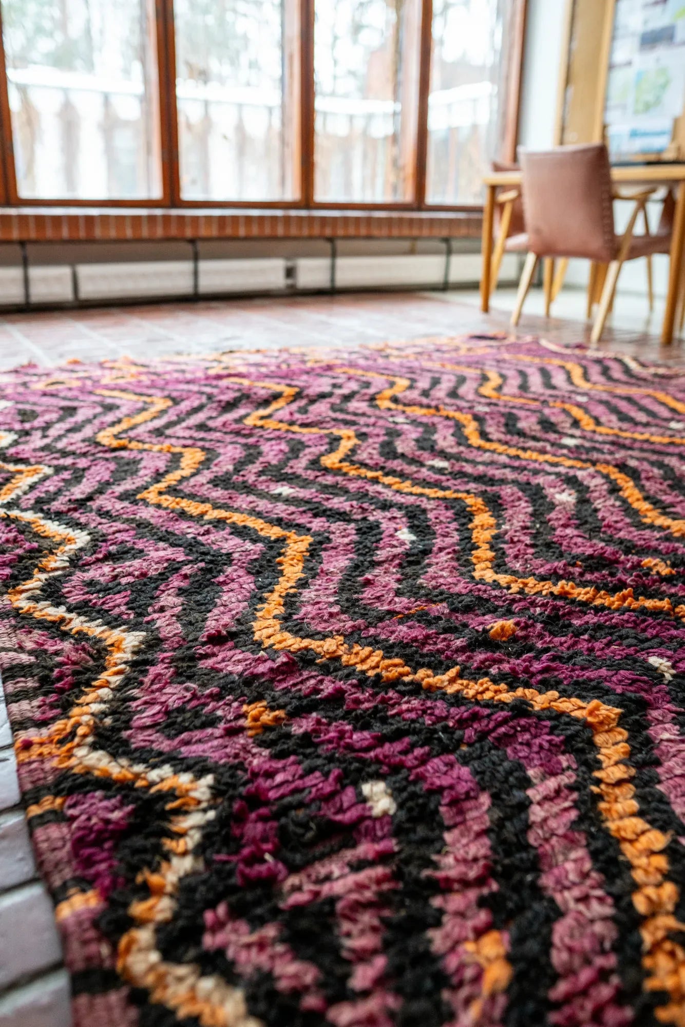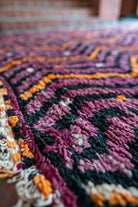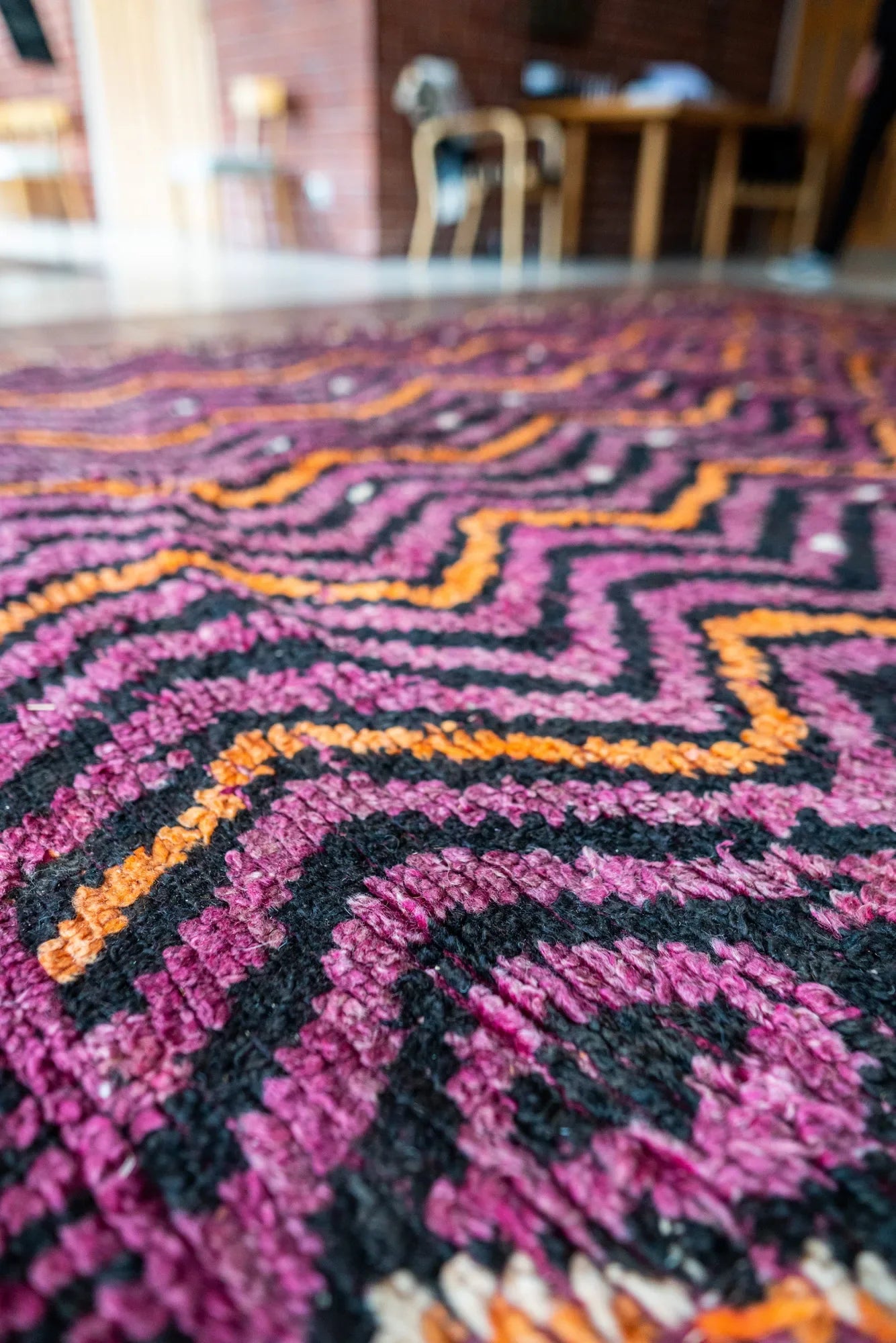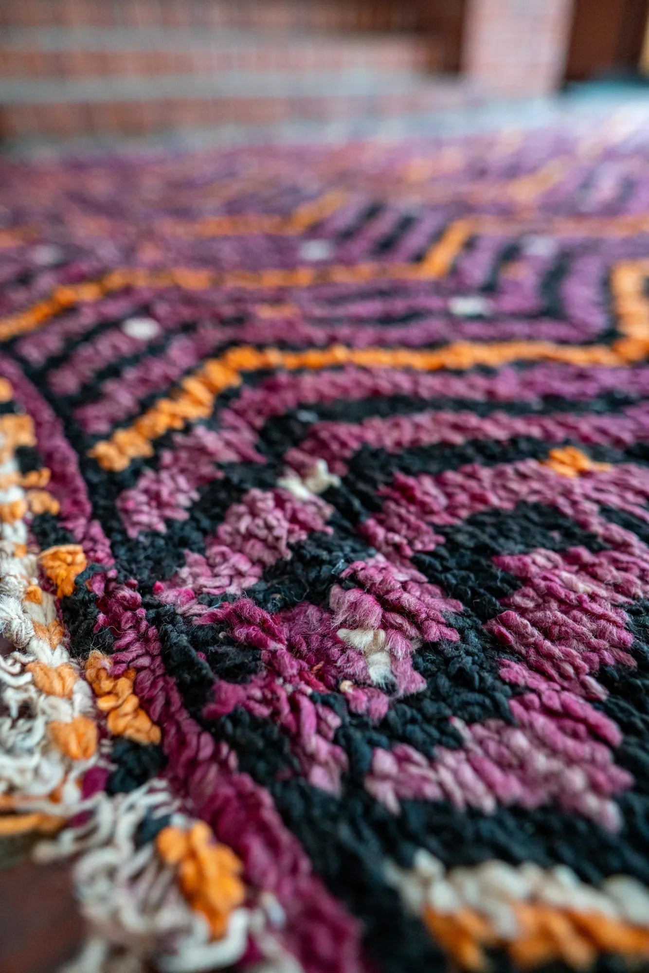 Ainutlaatuinen marokkolainen vintagematto Ait Tamassine -heimolta, vaikuttava yksilö niin värimaailmaltaan kuin kooltaankin. Lilan pohjan päällä kulkee näyttävä kuviointi oranssin, mustan ja luonnonvalkoisen sävyissä. Kokonaisuus on intensiivinen ja vangitseva, nimensä veroisesti todellinen taideteos.