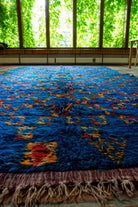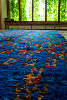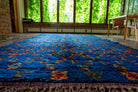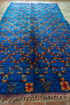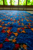 Harvinainen indigonsininen marokkolainen vintage-matto Beni M’Guild -heimolta. Upea sininen pohjaväri on värjätty aidolla luonnon indigolla — perinteisellä, mutta haastavalla, arvokkaalla ja nykyään harvinaisella tekniikalla. Oranssilla ja punaisella toteutettu tunnusomainen timanttikuvio tuo mattoon eloisuutta ja rytmiä.