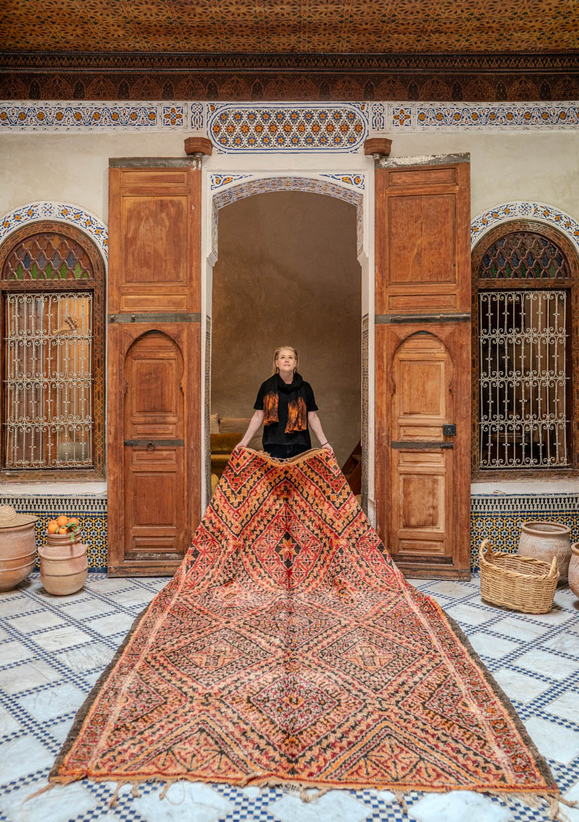 Salaperäisen kaunis marokkolainen Beni M’Guild vintage-matto kietoo tilan mystiseen loistoonsa. Syvän hohtava villa ja intensiiviset, vivahteikkaat punaoranssit sävyt vangitsevat katseen. Tummaruskea kuviointi tuo hienostunutta kontrastia ja rytmittää harmonisesti maton ajattoman kaunista värimaailmaa.