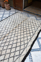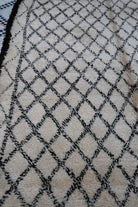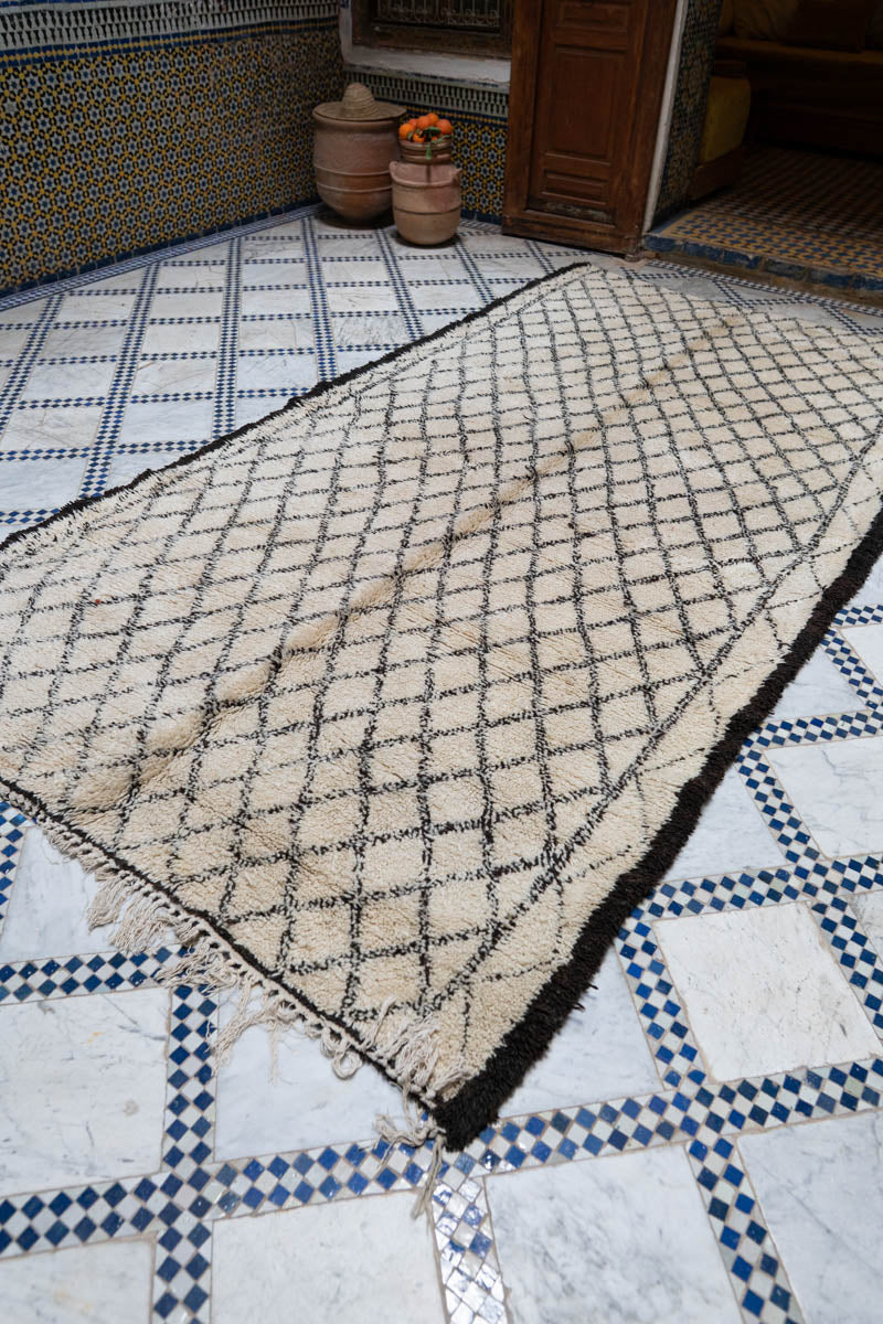 Tämä Beni Ouarain -matto on enemmän kuin vain sisustuselementti – se on pala kulttuurihistoriaa, kudottuna ajattomaan muotoon. Sen luonnonvaalea pohja toimii kankaana tiheään sommitellulle timanttikuviolle ja kaksinkertaiselle kehykselle, jotka on solmittu värjäämättömällä, syvän paahteisen ruskealla, lähes mustalla, villalla. Pienet käsin solmitut symbolit kurkistavat maton pohjapuolelta kuin hiljainen viesti menneiltä ajoilta.