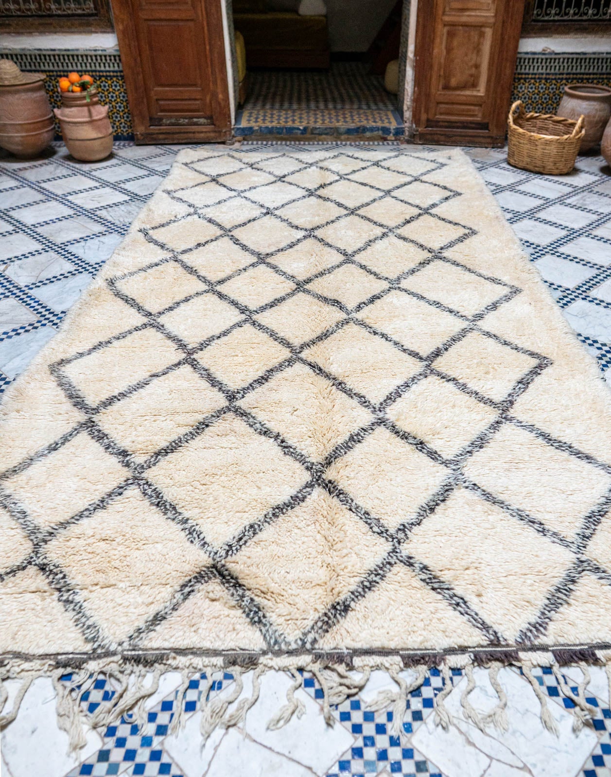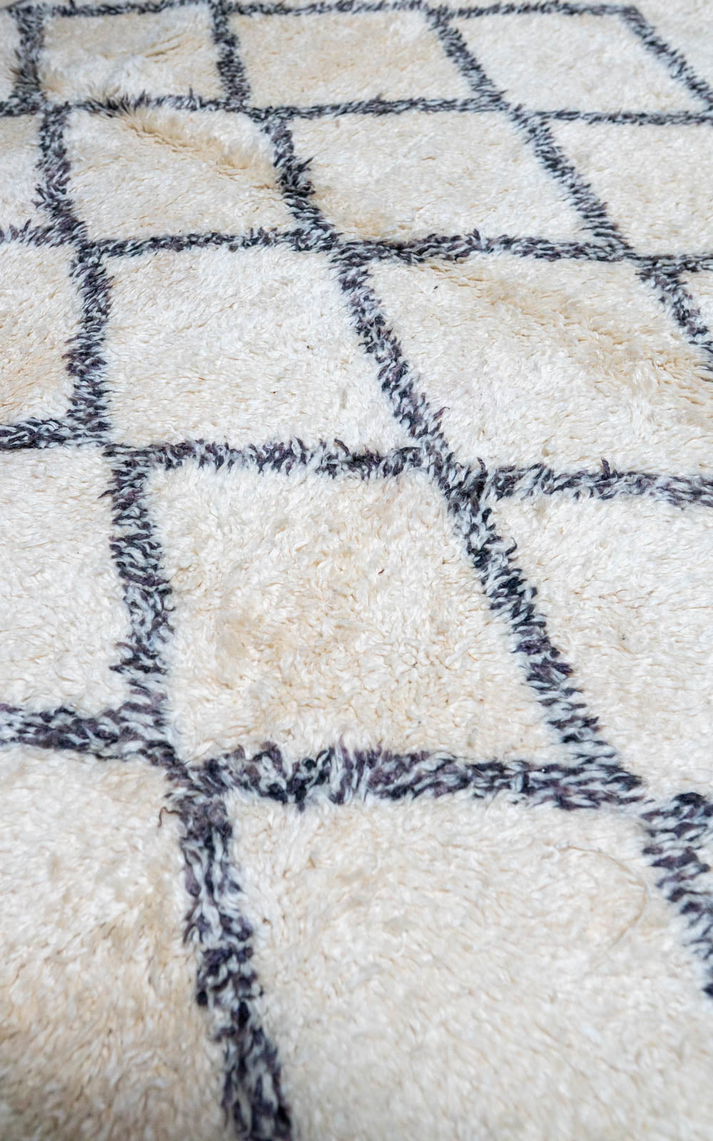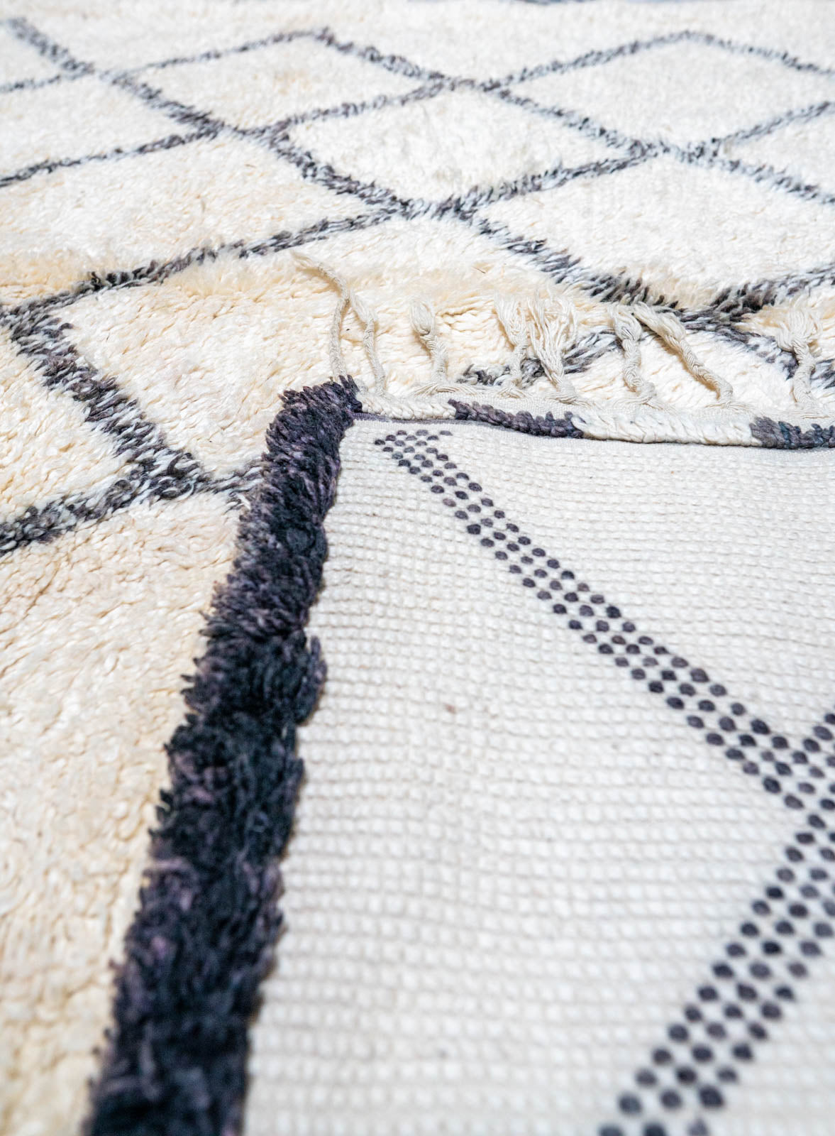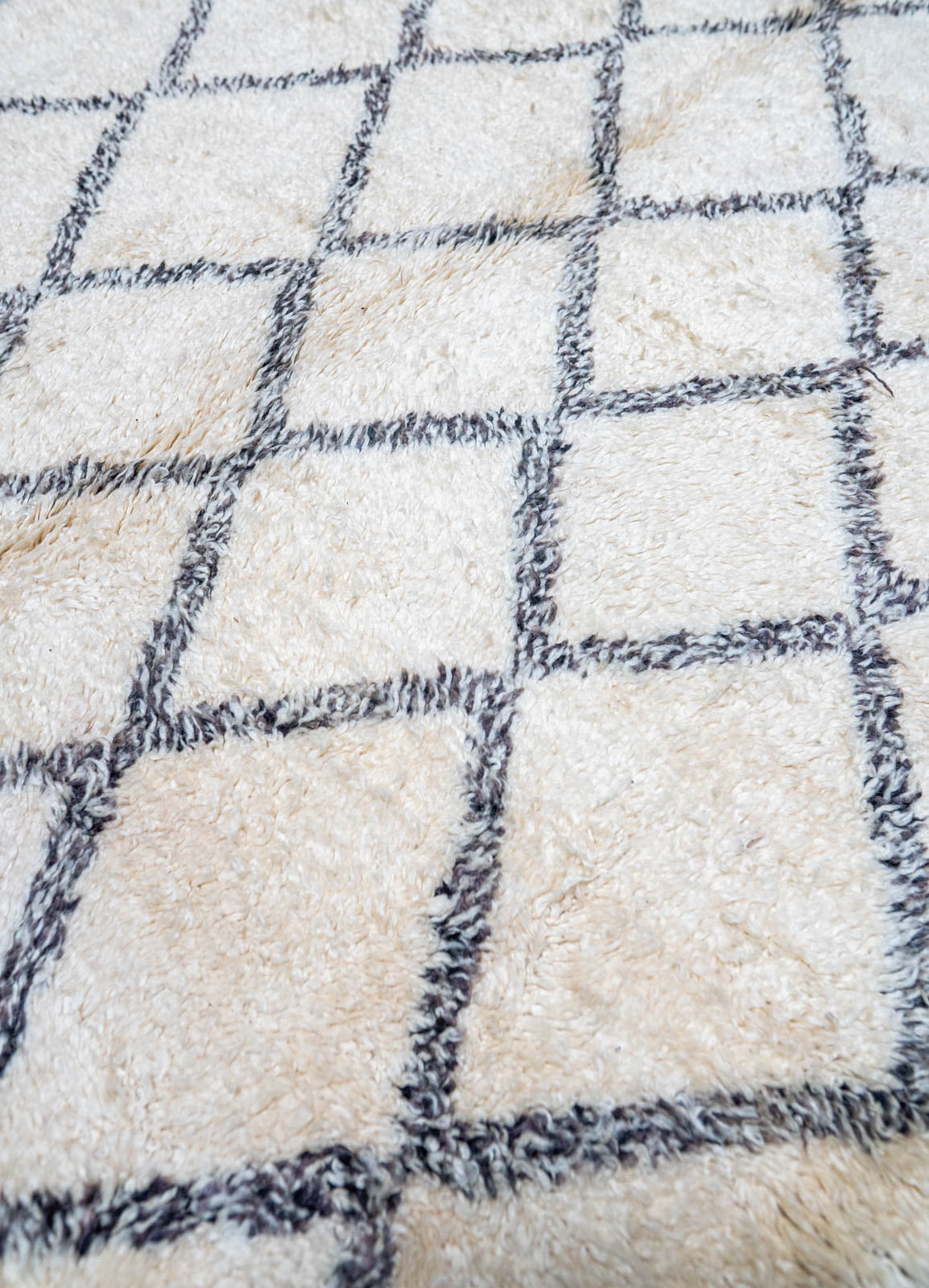 Ainutlaatuinen Beni Ouarain, jonka pehmeä ja hohtava villa on taianomainen. Ikäänsä nähden hyvässä kunnossa ja laatu on vertaansa vailla. Klassinen pelkistetty musta timanttikuvio luonnonvaalealla pohjalla. Kuvat kertovat paljon, mutta livenä pääsee vasta täysin oikeuksiinsa. Kyseessä todellinen keräilyharvinaisuus, jollaiseen Aallot ja kumppanit jo aikoinaan rakastuivat – eikä syyttä.