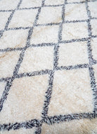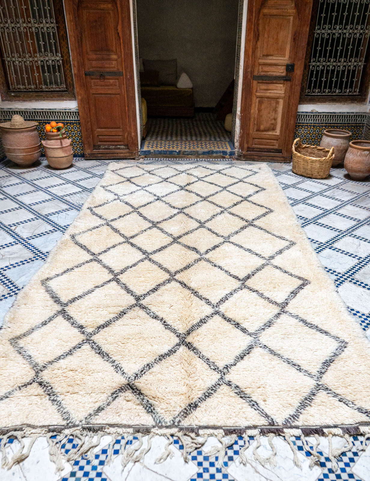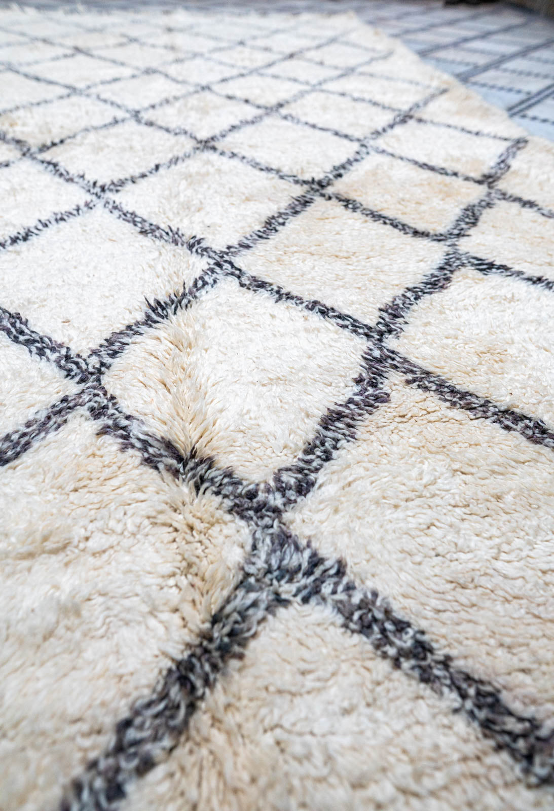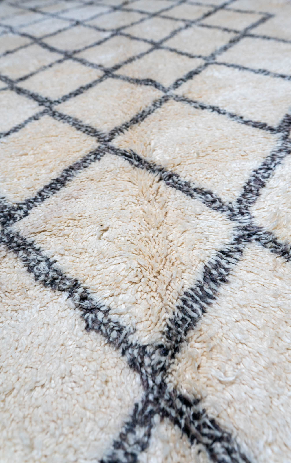 Ainutlaatuinen Beni Ouarain, jonka pehmeä ja hohtava villa on taianomainen. Ikäänsä nähden hyvässä kunnossa ja laatu on vertaansa vailla. Klassinen pelkistetty musta timanttikuvio luonnonvaalealla pohjalla. Kuvat kertovat paljon, mutta livenä pääsee vasta täysin oikeuksiinsa. Kyseessä todellinen keräilyharvinaisuus, jollaiseen Aallot ja kumppanit jo aikoinaan rakastuivat – eikä syyttä.