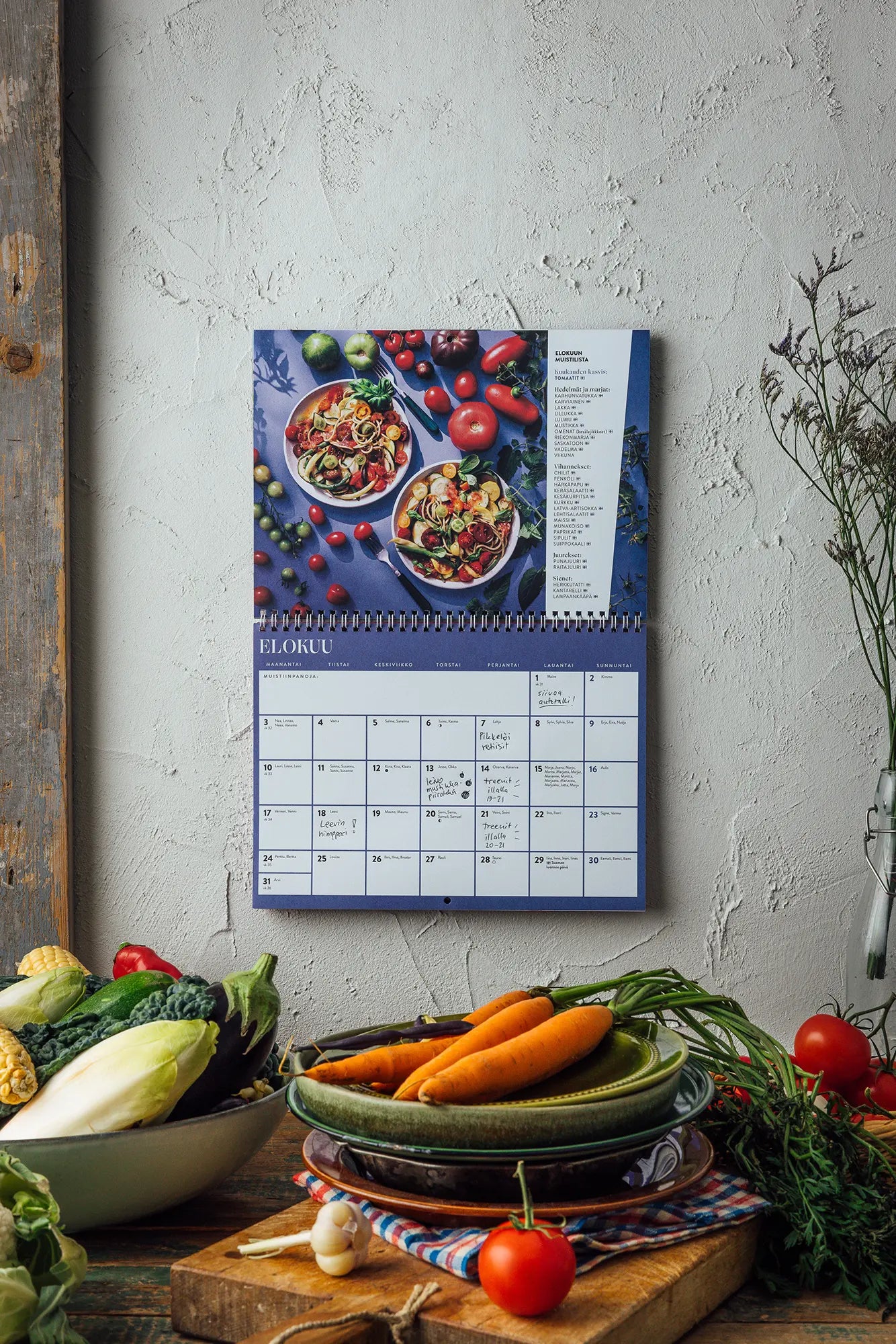 Hyödyllisen kasvistietouden lisäksi Satokausikalenteri toimii myös perinteisenä seinäkalenterina, joka sisältää nimipäivät, juhlapyhät, liputuspäivät, kuunkiertomerkinnät. Lisäksi kalenterissa on tilaa omille muistiinpanoille.